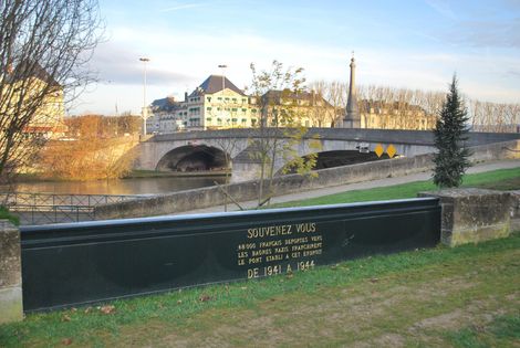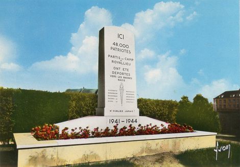 Cette stèle rappelle qu' "ICI 48 000 patriotes partis du camp de Royalllieu ont été déportés vers les bagnes nazis"